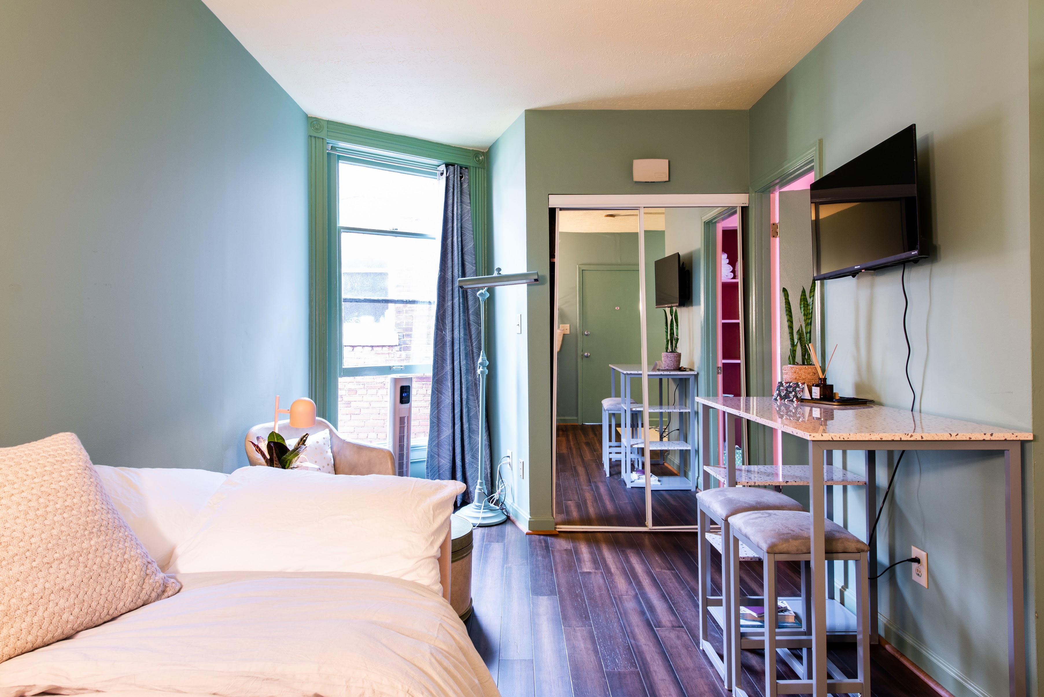 The first project at The Flats was to take a nice little studio and put a Wes Anderson spin on it, inspired by his cafe at the Prada Fondazione in Milan.